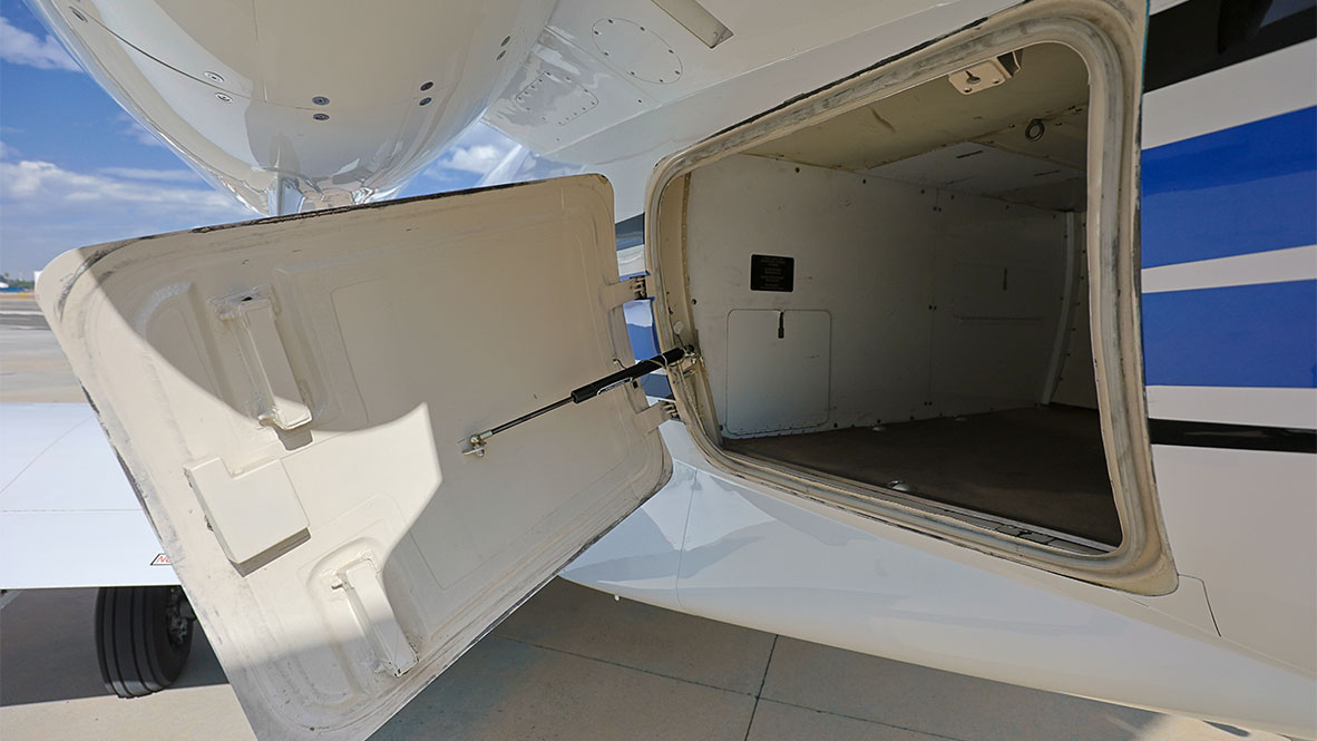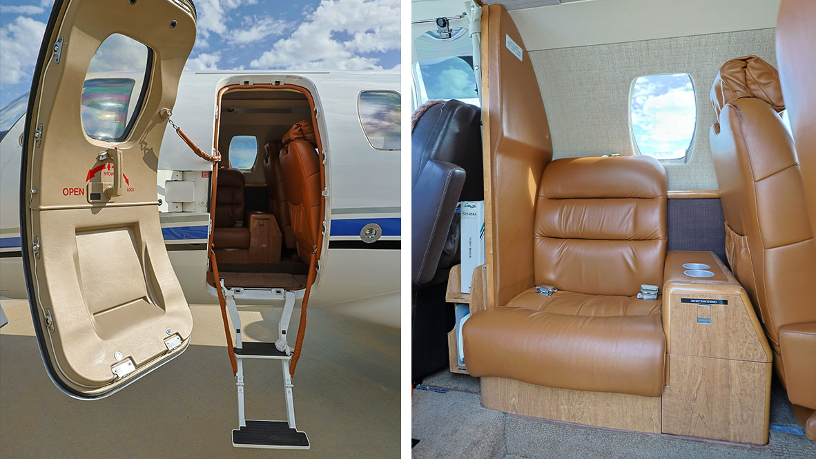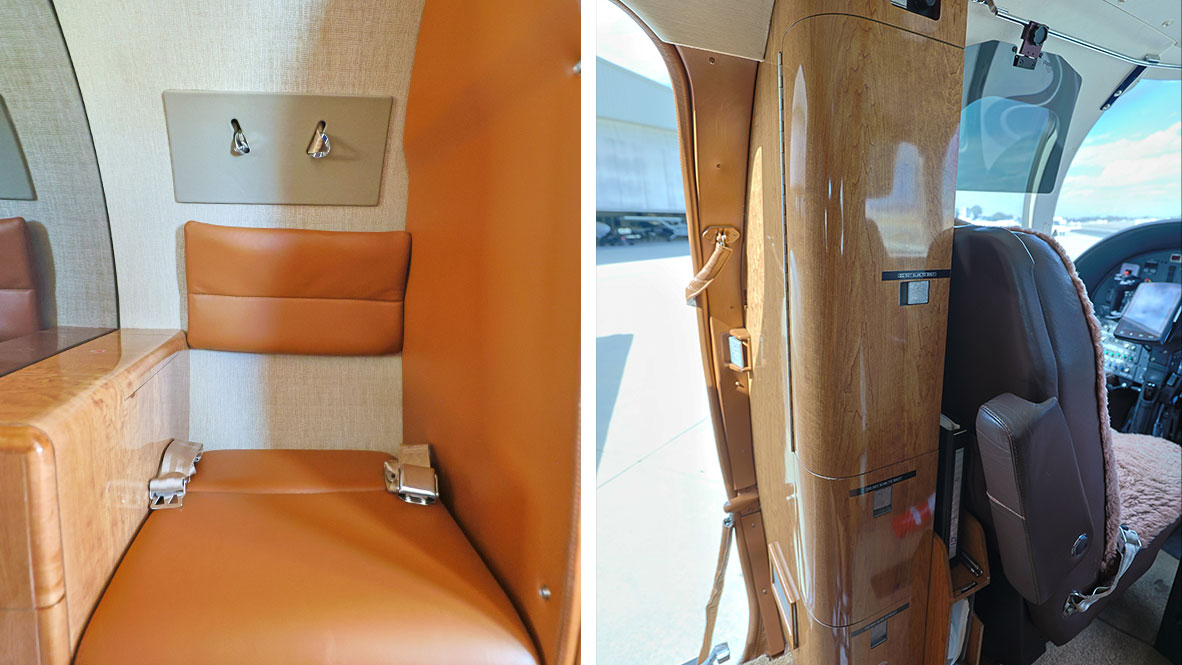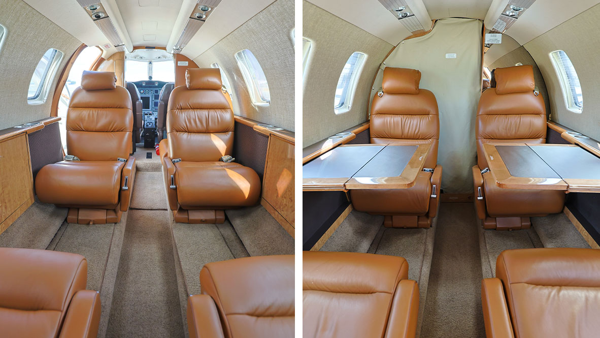| 2016 Interior update by Corrigan Air Center. Interior finished in earthy tones inclusive of natural maple cabinetry and drink rails. Cabin seats are a saddle leather (2016) accented by tan loop carpet. The lower sidewalls (2016) are finished in a complementary brown patterned stiching (2016) with linen fabric window surrounds and off white fabric headliner. Cockpit seats are covered in dark brown leather with light brown sheepskins (2016). |